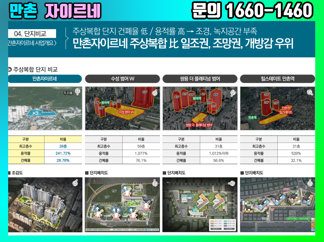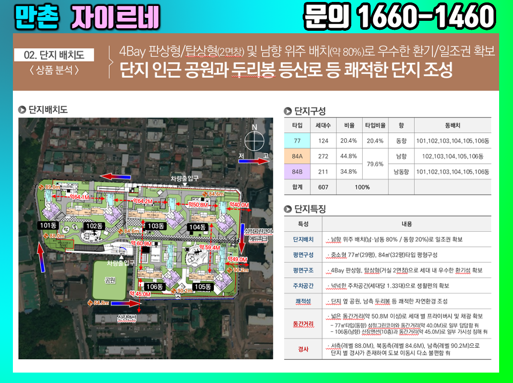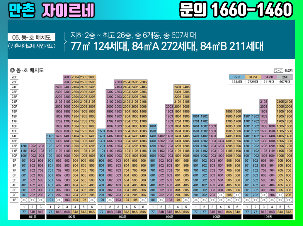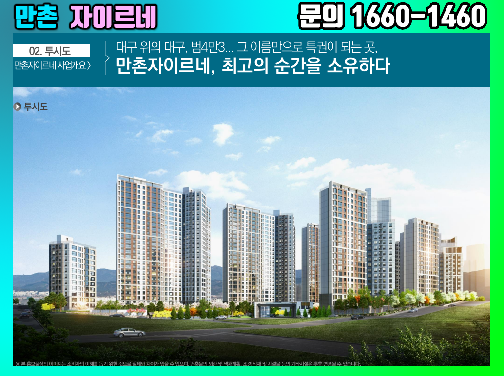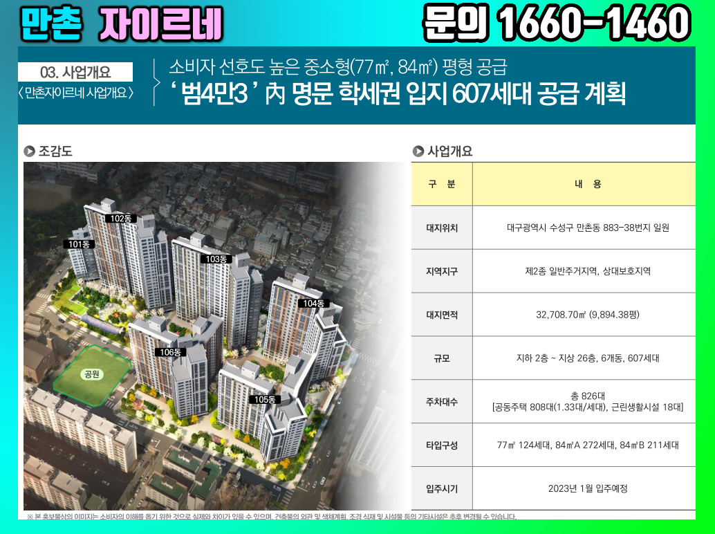 만촌 자이르네 사업지는 대구광역시 수성구 만촌동 883-38번지 일원에 위치합니다. 제 2종 일반주거지역으로 대지 9800여평에 지하 2층에서 지상 26층까지 6개동으로 이루어져 있으며 77타입, 84A타입, 84B타입 3가지의 타입으로 총 607세대로 구성되어있습니다.
