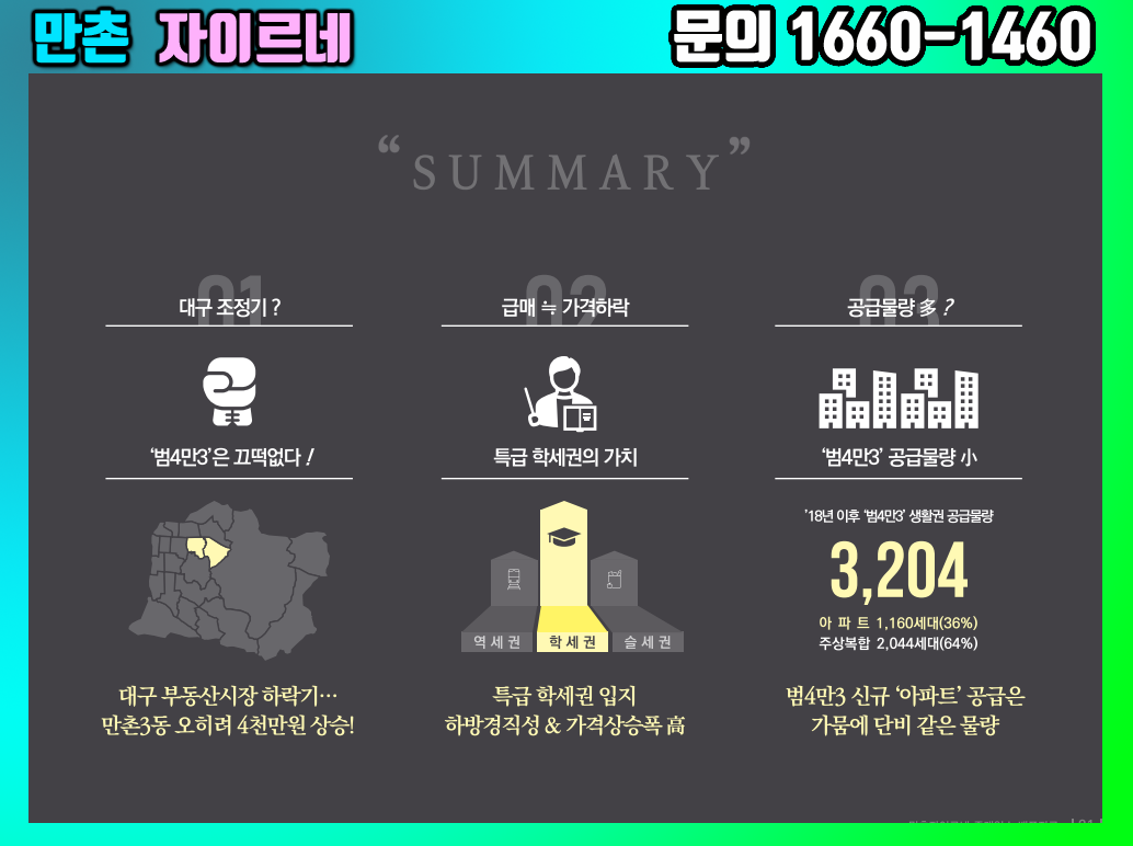 만촌동 인근 일대는 일명 '사'자 들어가는 전문직 종사자들이 선호하는 학구열 강한 동네로 전문직 자녀분들을 학업을 위해 인근으로 이주를 선택하고 계십니다. 그만큼 신축 대단지 아파트들도 높은 시세를 형성하고 있으며 미분양과 가격하락에도 보란듯이 시세를 유지하고 높은 가격으로 남다른 자부심을 가지고 있는 동네라고 볼 수 있는데요 대구의 강남이라 불리울 만큼 학세권의 인기가 뜨겁다고 볼 수 있습니다.