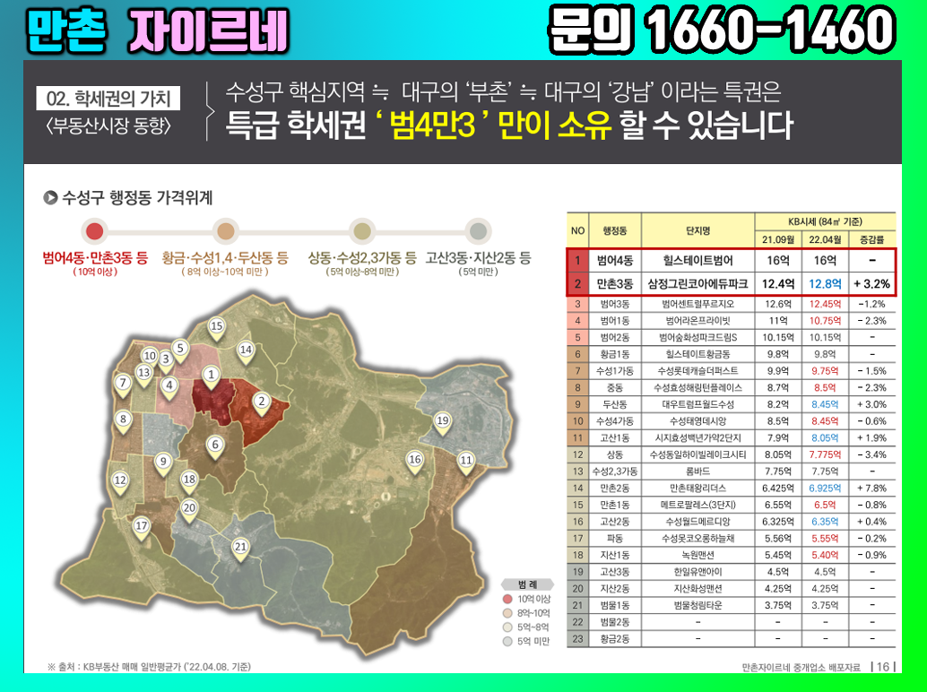 범어4동과 만촌3동은 이런 하락장 속에서도 오히려 가격이 4천만원 가량 오르는 진기록을 갱신중에 있는데요