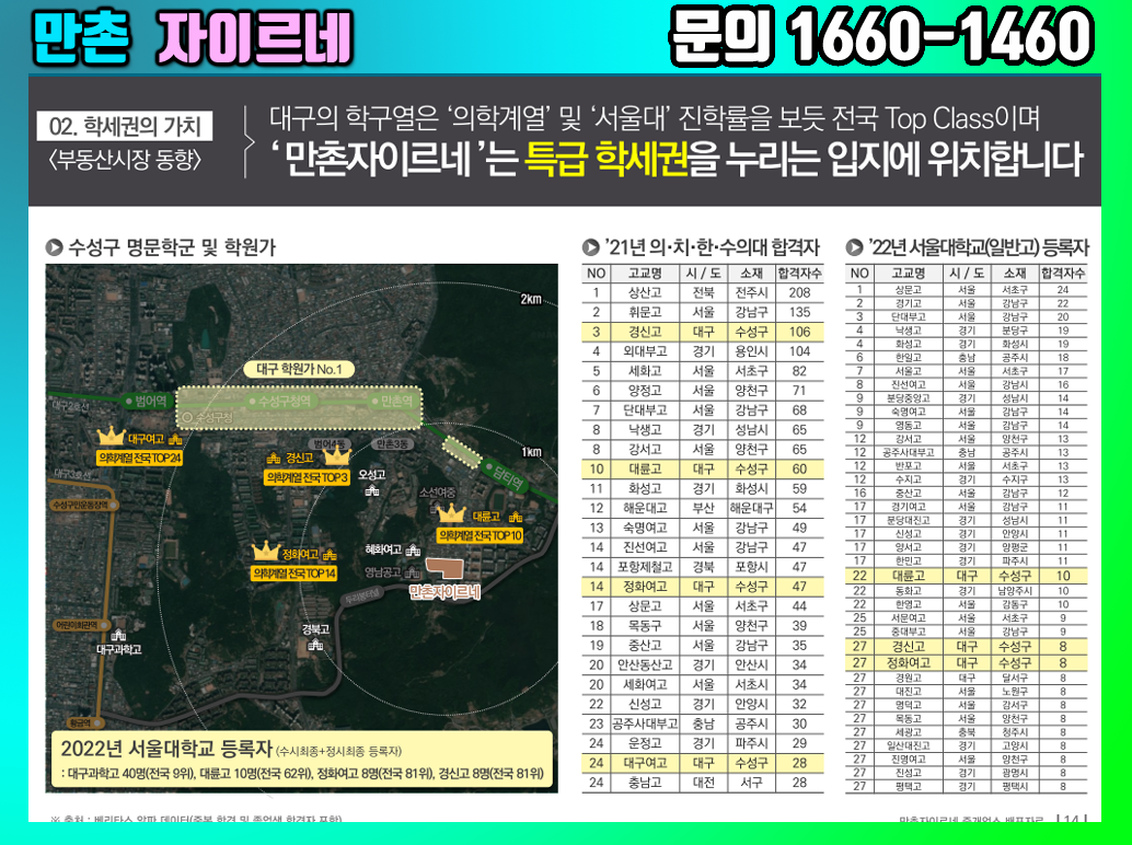 만촌 자이르네가 위치한 만촌동 일대 주변 학군을 살펴보자면 21년도 기준 의, 치, 한, 수의대 합격자 수 3위를 기록하고 있는 경신고등학교가 106명을 합격시키고 대륜고가 60명 정화여고가 47명 대구여고 28명 등 상위 학교 30위 안쪽으로 4개의 학교가 위치하고 있습니다. 그중 경신고와 대륜고는 탑10에 들만큼 명문학군으로써의 위상을 떨치고 있습니다.
