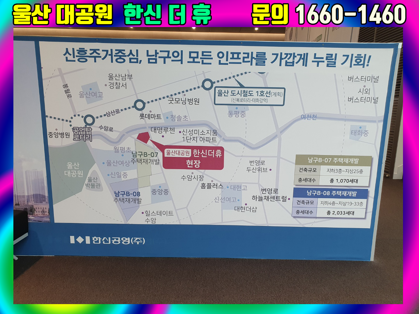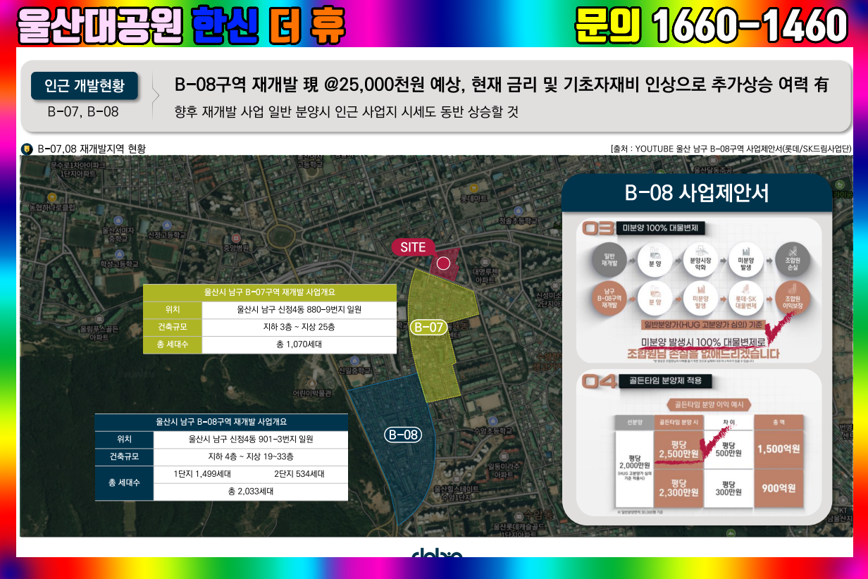 울산대공원 한신더휴 아파트 단지는 B08구역 재개발 호재로 수혜를 볼 수 있는 자리로 기대가 큽니다. 07구역 신정4동 880-9번지 일원에 1000세대가 예정에 있으며 08구역 신정4동 901-3번지 일원으로도 2000여 세대 아파트 단지가 추가로 들어올 예정입니다. 추후 분양될 아파트 단지에 비해 평당 200~300만원 저렴한 가격으로 현재 분양중에 있어 향후 시세차익에 따른 매매가 상승까지 기대해 볼 수 있겠습니다.