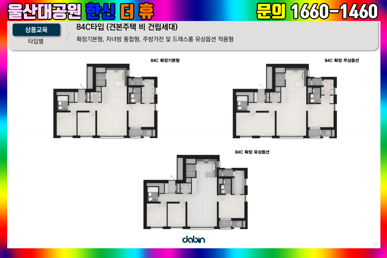 울산대공원 한신더휴 아파트 단지는 84타입이 절반이상 차지하는 비율로 가장많이 선호하는 평형대를 주력으로 구성하였습니다. 168세대가 84타입으로 107세대가 62타입으로 구성되어 있어 요즘 많이들 선호하는 중형 평형대위주의 구성입니다.