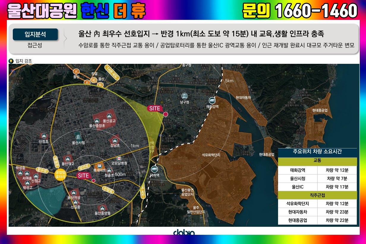 태화강역까지 차량 12분 울산시청 약 7분 울산 ic까지 17분이면 접근이 가능합니다. 산단기준으로는 석유화학단지가 차량으로 약 12분 현대차 23분 현대중공업 약 22분가량 소요되는 최적의 자리입니다.