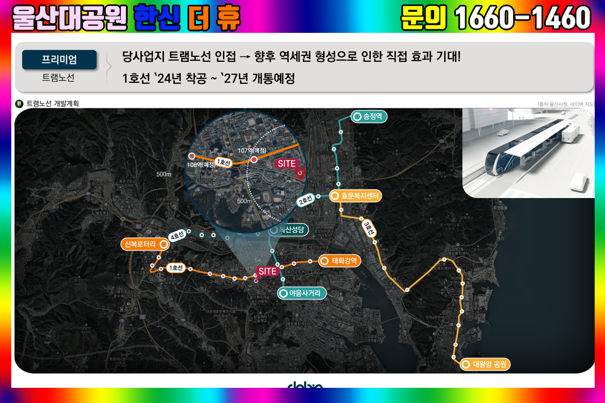 울산대공원 한신더휴 아파트 단지는 사업지에서 트램노선과 인접하여 역세권형성으로 인한 직접 효과를 누리를 있는 자리 입니다. 공업탑 로터리 인근으로 역이 들어서면서 도보권으로 이용이 가능할 것으로 전망되어 집니다. 트램 1호선 노선은 24년도부터 착공 시작하여 27년 개통예정입니다.