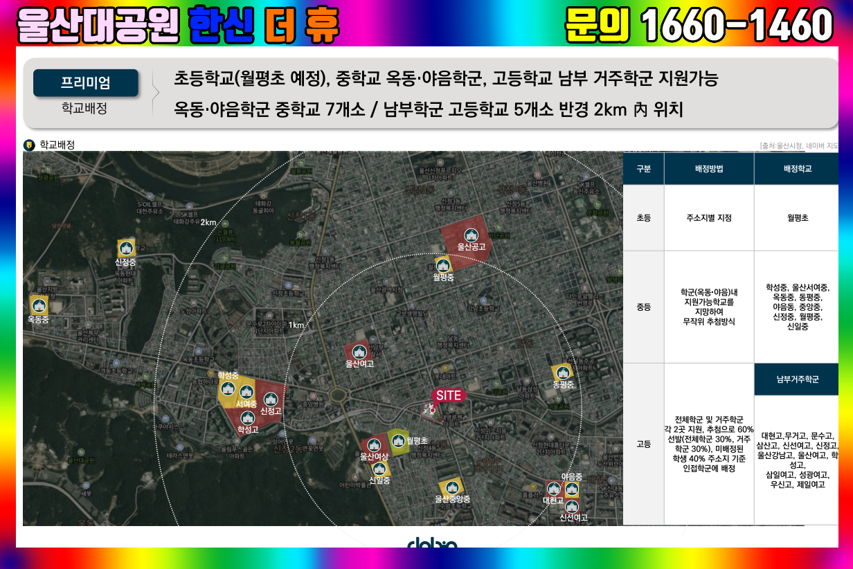 초등학교 배정은 월평초등학교 예정되어 있으며 중학교는 옥동, 야음학군, 고등학교 남부거주학군 지원이 가능합니다. 옥동과 야음동에 있는 중학교 7개 학교와 남부학군 고등학교 5개학교가 반경 2km 이내에 위치하고 있어 우수한 학군을 자랑합니다.