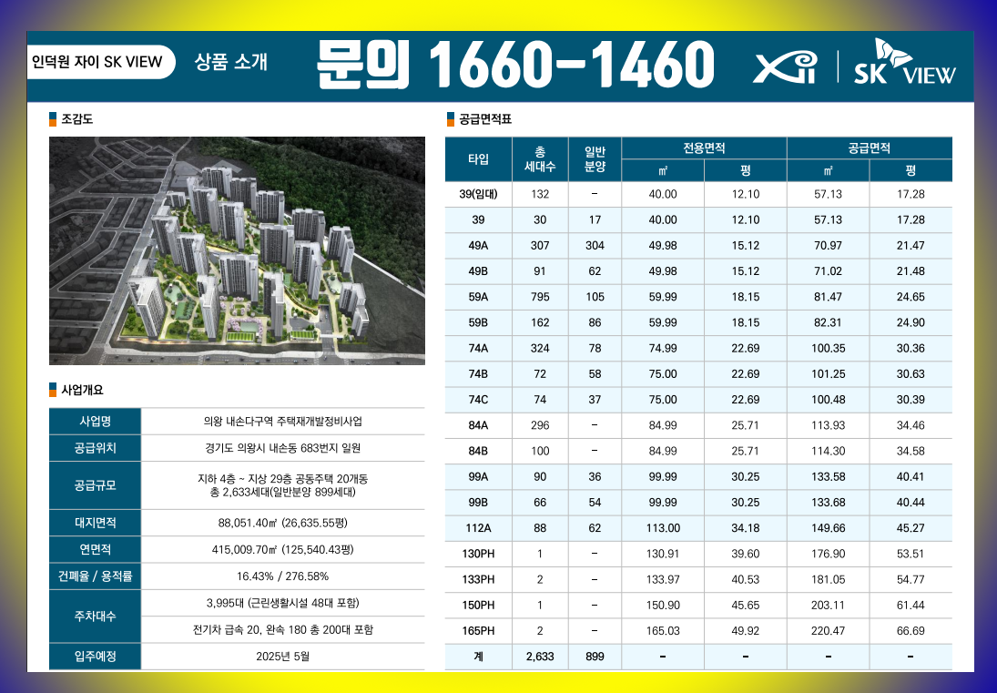 인덕원자이sk뷰 아파트 사업지는 의왕 내손다구역 주택재개발정비사업으로 경기도 의왕시 내손동 683번지 일원에 위치합니다. 지하 4층에서 지상 29층까지 공동주택 20개동으로 구성되며 26000여평 대지 위에 임대주택부터 팬트하우스까지 소형부터 중형 중대형 대형 평형대로 전용 39타입부터 165타입까지 모든 평형대를 다 갖추고 있는 아파트 단지라고 보시면되겠습니다.