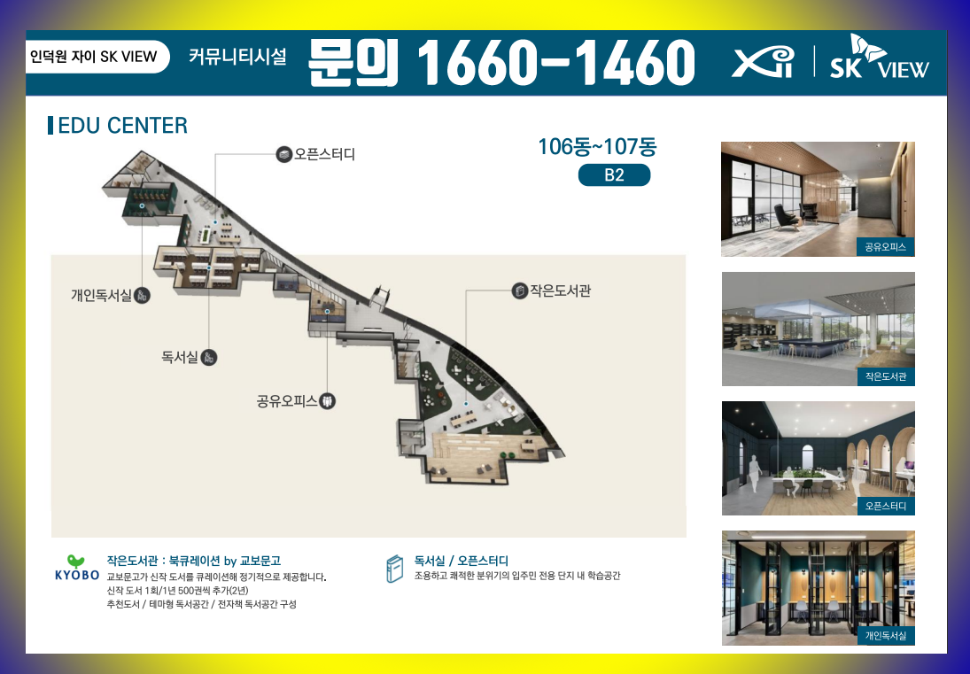 2000세대가 넘는 대단지인 만큼 커뮤니티시설 또한 독보적이라 말씀드릴 수 있는데요 자녀들 공부하기 좋은 에듀센터를 별로로 운영하여 개인독서실과 오픈스터디방 도서관 공유오피스를 제공합니다. 도서관같은경우 교보문고에서 직접 신작도서를 큐레이션해 정기적으로 제공합니다. 1년에 500권씩 제공한다고 하니 아이들이 좋아하겠네요