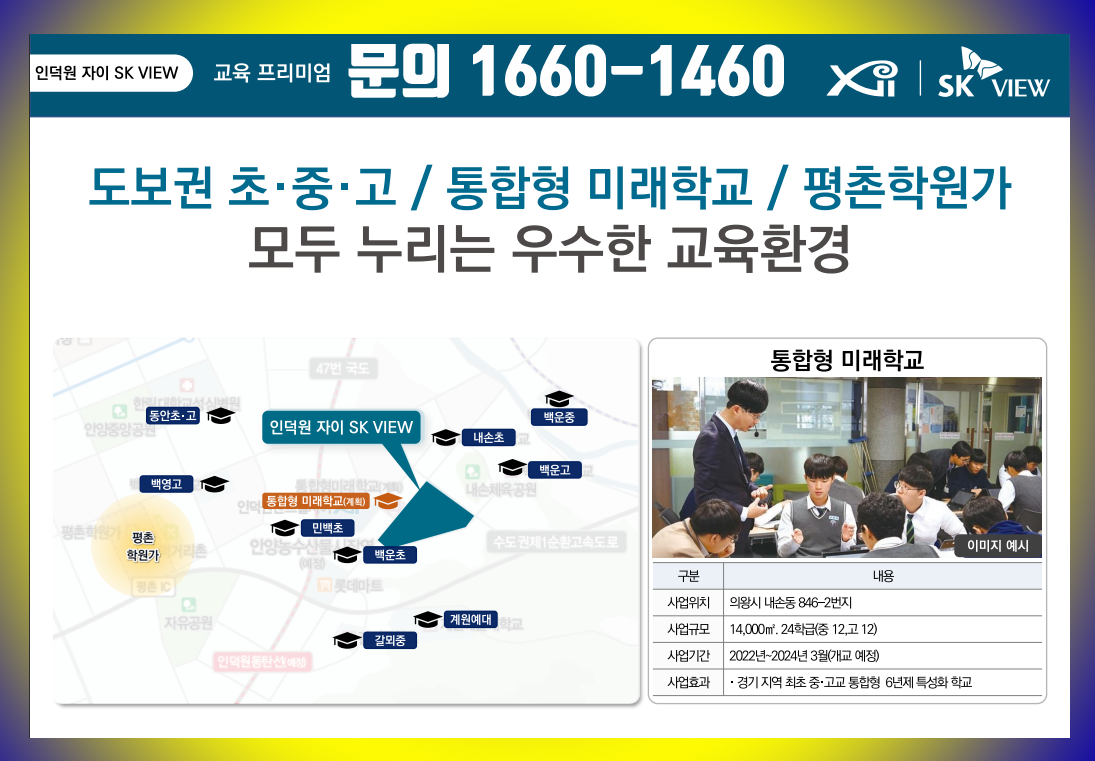 당 사업지 주변으로는 4호선 평촌역, 인덕원역 등이 인접해있으며 수도권 제1순환고속도로 제2경인고속도로와 47번 국도에 가까이 있어 어디든 가까운 쾌속 광역 교통망을 자랑합니다. 또한 동탄,인덕원선과 월곶판교선, 통합형미래학교등이 계획중에 있어 개발호재도 풍부한 미래가치를 가지고 있습니다.